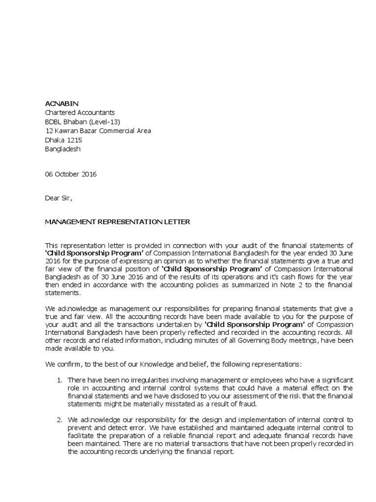 Example Of A Management Representation Letter Pdf